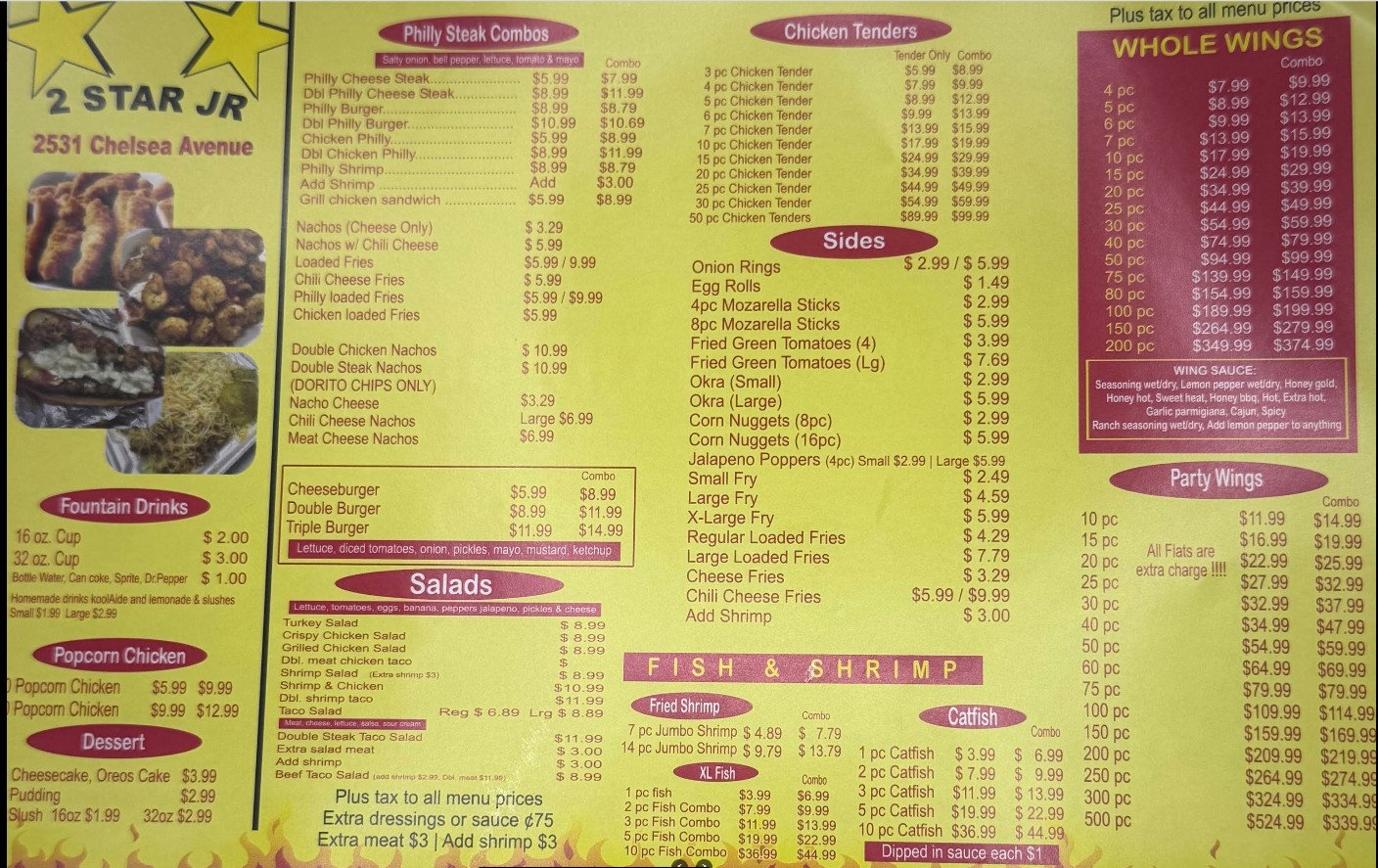 Welcome to 2 Star Jr Restaurant in Memphis, a popular spot known for its affordable comfort food and quick bites. The menu features a variety of favorites including wings, burgers, fries, and classic American dishes served in a casual setting. Whether you're grabbing a quick meal or satisfying late-night cravings, 2 Star Jr offers flavorful options at budget-friendly prices. Explore the full 2 Star Jr Restaurant menu with updated prices and find out what to try on your next visit.